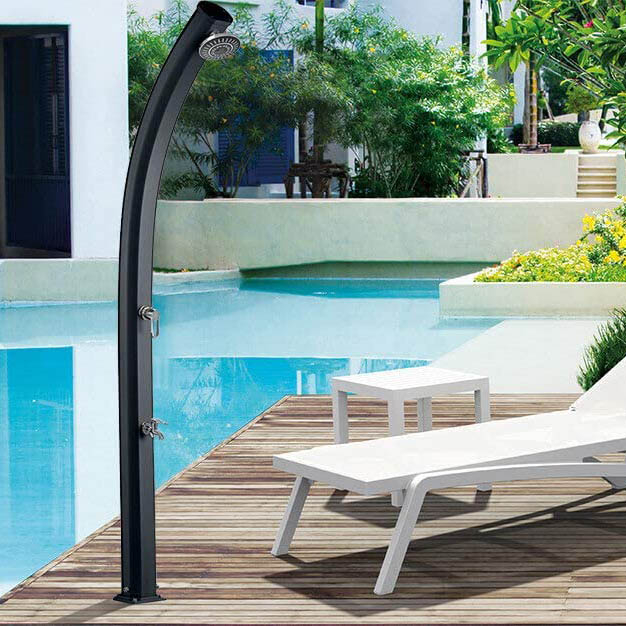 Prysznic solarny Aquaviva Jolly to doskonała opcja do Twojego domku letniskowego, ogrodu czy basenu. Służy do kąpieli na świeżym powietrzu. Zbiornik na wodę znajduje się wewnątrz obudowy. Woda jest podgrzewana przez promieniowanie słoneczne. Oszczędza to pieniądze i sprawia, że urządzenie jest przyjazne dla środowiska. Wykonany jest z malowanego aluminium, co gwarantuje niezawodność i trwałość wyrobu. Wyposażony jest w wygodną baterię jednouchwytową oraz osobny kranik do mycia stóp.